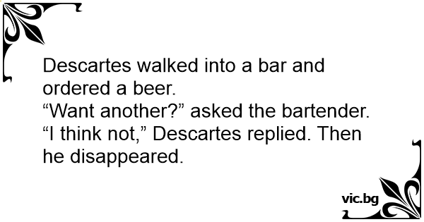 Descartes walked into a bar and ordered a вееr.<br />“Want another?” asked the bartender.<br />“I think not,” Descartes replied. Then he disappeared.