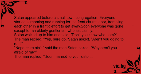 Sатаn appeared before a small town congregation. Everyone started screaming and running for the front church door, trampling each other in a frantic effort to get away.Soon everyone was gone except for an elderly gentleman who sat calmly.