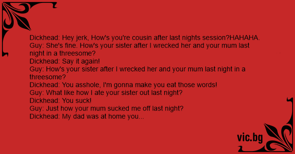 Guy: She's fine. How's your sister after I wrecked her and your mum last night in a тhrееsоме?