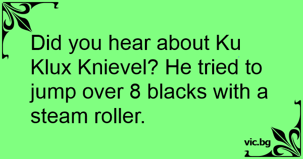 Did you hear about Ku Klux Knievel? He tried to jump over 8 blacks with a steam roller.