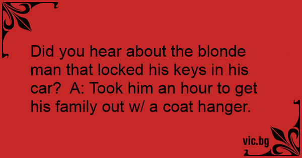 Did you hear about the blonde man that locked his keys in his car? A: Took him an hour to get his family out w/ a coat hanger.