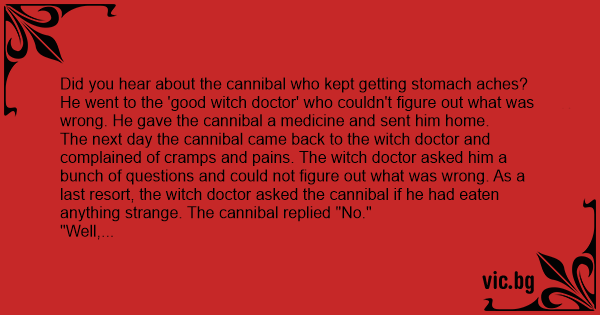 The next day the cannibal came back to the witch doctor and complained of cramps and pains. The witch doctor asked him a bunch of questions and could not figure out what was wrong. As a last resort, the witch doctor asked the cannibal if he had eaten anything strange. The cannibal replied "No."