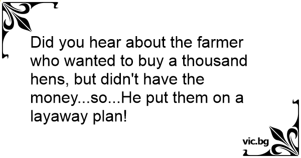 Did you hear about the farmer who wanted to buy a thousand hens, but didn't have the money...so...He put them on a layaway plan!