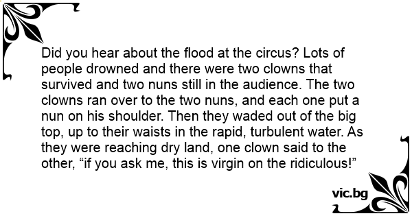 Did you hear about the flood at the circus? Lots of people drowned and there were two clowns that survived and two nuns still in the audience. The two clowns ran over to the two nuns, and each one put a nun on his shoulder. Then they waded out of the big top, up to their waists in the rapid, turbulent water. As they were reaching dry land, one clown said to the other, “if you ask me, this is virgin on the ridiculous!”
