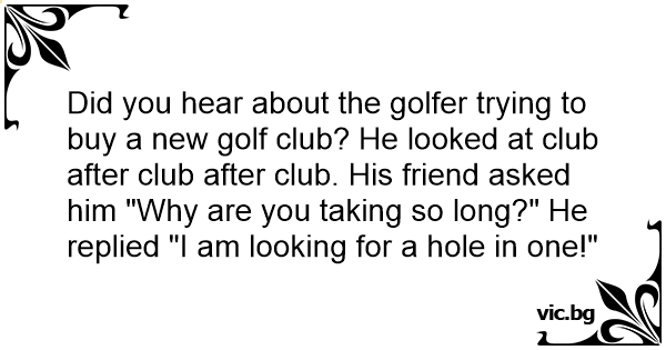 Did you hear about the golfer trying to buy a new golf club? He looked at club after club after club. His friend asked him "Why are you taking so long?" He replied "I am looking for a hole in one!"