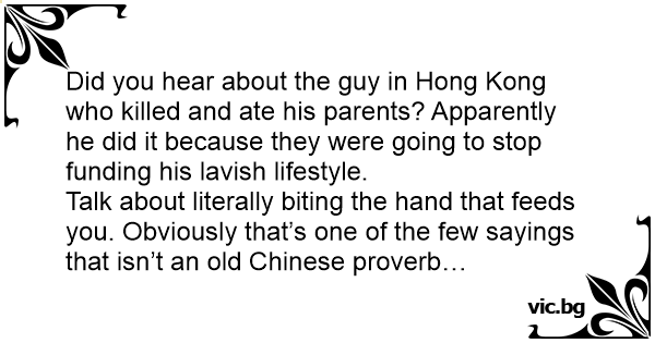 Did you hear about the guy in Hong Kong who killed and ate his parents? Apparently he did it because they were going to stop funding his lavish lifestyle.