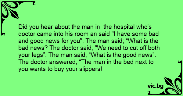 Did you hear about the man in the hospital who's doctor came into his room an said "I have some bad and good news for you". The man said; “What is the bad news? The doctor said; "We need to cut off both your legs”. The man said, “What is the good news”. The doctor answered, “The man in the bed next to you wants to buy your slippers!