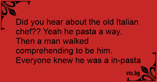 Did you hear about the old Italian chef?? Yeah he pasta a way. Then a man walked comprehending to be him. Everyone knew he was a in-pasta