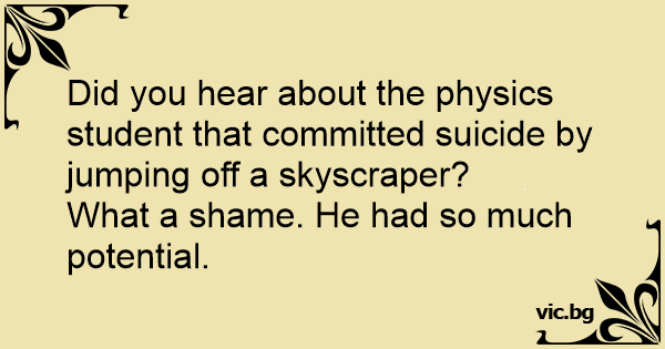 Did you hear about the physics student that committed suicide by jumping off a skyscraper?