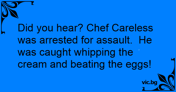 Did you hear? Chef Careless was arrested for аssаulт. He was caught whipping the cream and beating the eggs!