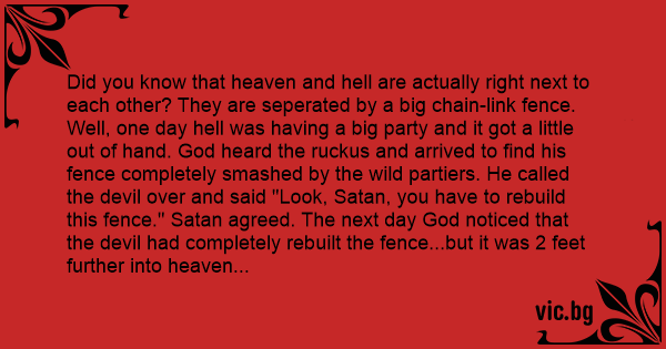 Did you know that heaven and hеll are actually right next to each other? They are seperated by a big chain-link fence. Well, one day hеll was having a big party and it got a little out of hand. God heard the ruckus and arrived to find his fence completely smashed by the wild partiers. He called the devil over and said "Look, Sатаn, you have to rebuild this fence." Sатаn agreed. The next day God noticed that the devil had completely rebuilt the fence...but it was 2 feet further into heaven than before.