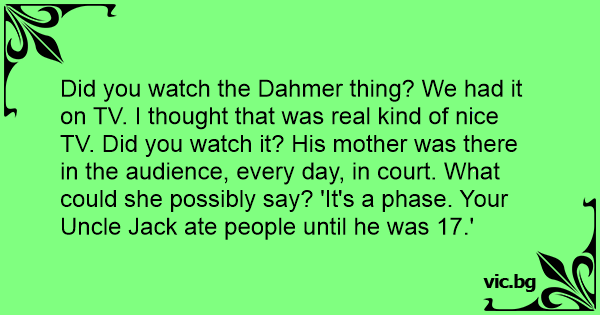 Did you watch the Dahmer thing? We had it on TV. I thought that was real kind of nice TV. Did you watch it? His mother was there in the audience, every day, in court. What could she possibly say? 'It's a phase. Your Uncle Jack ate people until he was 17.'