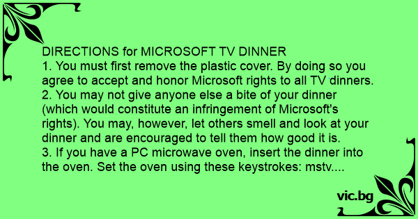 1. You must first remove the plastic cover. By doing so you agree to accept and honor Microsoft rights to all TV dinners.