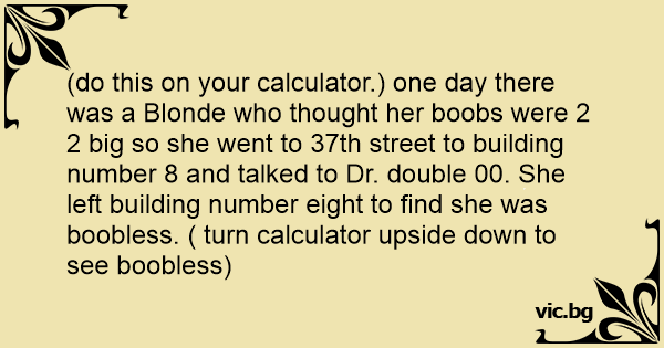 (do this on your calculator.) one day there was a Blonde who thought her воовs were 2 2 big so she went to 37th street to building number 8 and talked to Dr. double 00. She left building number eight to find she was boobless. ( turn calculator upside down to see boobless)