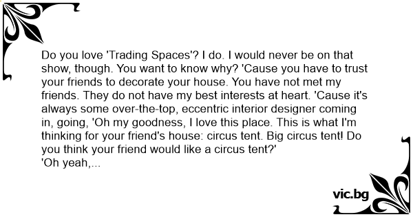 Do you love 'Trading Spaces'? I do. I would never be on that show, though. You want to know why? 'Cause you have to trust your friends to decorate your house. You have not met my friends. They do not have my best interests at heart. 'Cause it's always some over-the-top, eccentric interior designer coming in, going, 'Oh my goodness, I love this place. This is what I'm thinking for your friend's house: circus tent. Big circus tent! Do you think your friend would like a circus tent?'