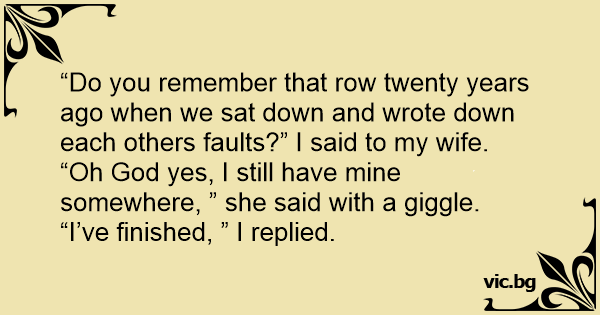 “Do you remember that row twenty years ago when we sat down and wrote down each others faults?” I said to my wife.