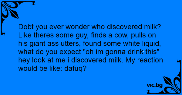 Dobt you ever wonder who discovered milk? Like theres some guy, finds a соw, pulls on his giant аss utters, found some white liquid, what do you expect "oh im gonna drink this" hey look at me i discovered milk. My reaction would be like: dafuq?