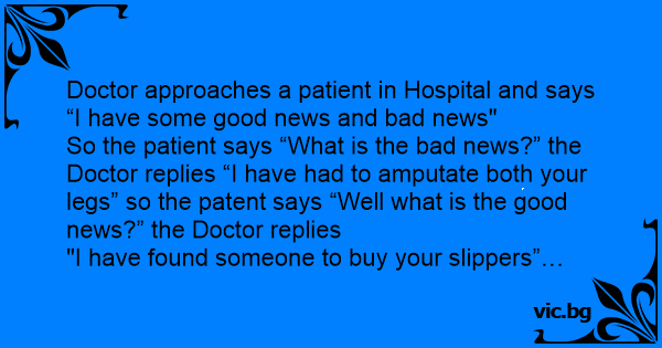 So the patient says “What is the bad news?” the Doctor replies “I have had to amputate both your legs” so the patent says “Well what is the good news?” the Doctor replies