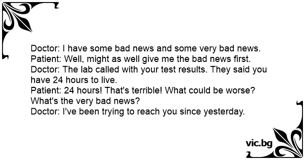 My dotor told me: "I've tow news for U; one good and the other one bad, which one do U prefer to hear first?" I replied I prefer the good one. Doctor: "U will die after next 24 hours!" I told: "Then what is the bad newsrnDoctor: "I forgot to tell U yesterday!"