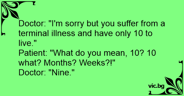 Pasienten: Doktor, hvor lenge har jeg igjen? Doktoren: 10. Pasienten: 10 hva? Dager? Uker? Måneder? År? Doktoren: 9.. 8.. 7.. 6..