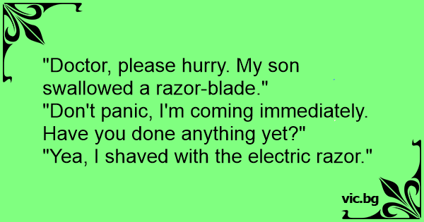 "Doctor, please hurry. My son swallowed a razor-blade."