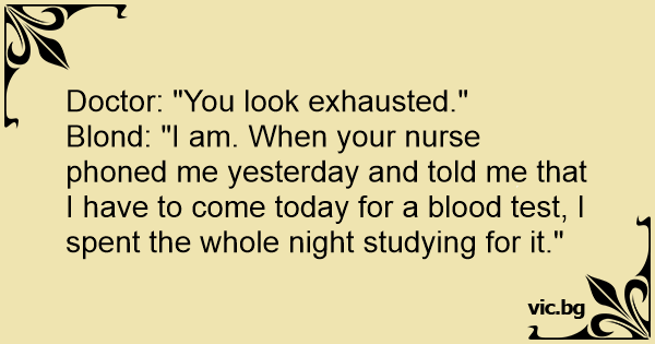 Blond: "I am. When your nurse phoned me yesterday and told me that I have to come today for a blood test, I spent the whole night studying for it."
