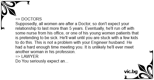Supposedly, all women are after a Doctor, so don't expect your relationship to last more than 5 years. Eventually, he'll run off with some nurse from his office, or one of his young women patients that is pretending to be sick. He'll wait until you are stuck with a few kids to do this. This is not a problem with your Engineer husband. He had a hard enough time meeting you. It is unlikely he'll ever meet another woman in his profession.