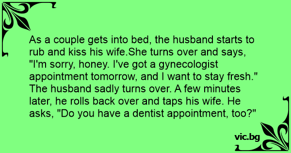 The husband sadly turns over. A few minutes later, he rolls back over and taps his wife. He asks, "Do you have a dentist appointment, too?"