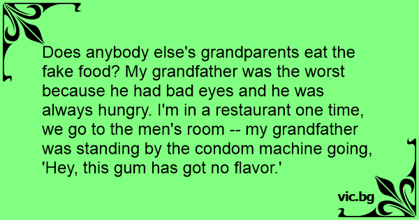 Does anybody else's grandparents eat the fake food? My grandfather was the worst because he had bad eyes and he was always hungry. I'm in a restaurant one time, we go to the men's room -- my grandfather was standing by the соndом machine going, 'Hey, this gum has got no flavor.'