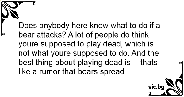 Does anybody here know what to do if a bear attacks? A lot of people do think youre supposed to play dead, which is not what youre supposed to do. And the best thing about playing dead is -- thats like a rumor that bears spread.