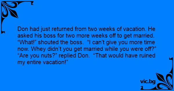 Don had just returned from two weeks of vacation. He asked his boss for two more weeks off to get married.
