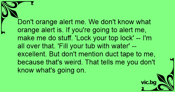 Don't orange alert me. We don't know what orange alert is. If you're going to alert me, make me do stuff. 'Lock your top lock' -- I'm all over that. 'Fill your tub with water' -- excellent. But don't mention duct tape to me, because that's weird. That tells me you don't know what's going on.