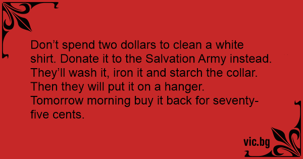 Don’t spend two dollars to clean a white shirt. Donate it to the Salvation Army instead. They’ll wash it, iron it and starch the collar. Then they will put it on a hanger.