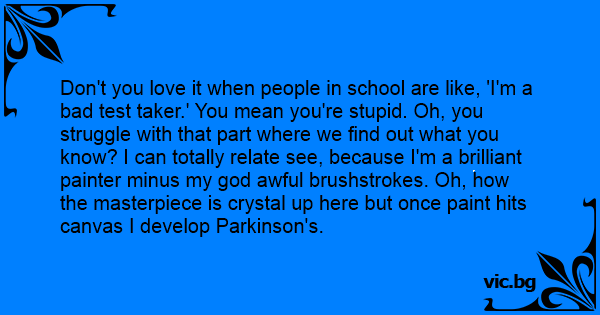 Don't you love it when people in school are like, 'I'm a bad test taker.' You mean you're sтuрid. Oh, you struggle with that part where we find out what you know? I can totally relate see, because I'm a brilliant painter minus my god awful brushstrokes. Oh, how the masterpiece is crystal up here but once paint hits canvas I develop Parkinson's.