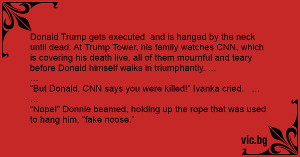 Donald Trump gets executed and is hanged by the neck until dead. At Trump Tower, his family watches CNN, which is covering his death live, all of them mournful and teary before Donald himself walks in triumphantly. …