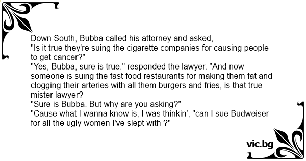 "Yes, Bubba, sure is true." responded the lawyer. "And now someone is suing the fast food restaurants for making them fат and clogging their arteries with all them burgers and fries, is that true mister lawyer?