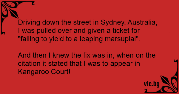 Driving down the street in Sydney, Australia, I was pulled over and given a ticket for "failing to yield to a leaping marsupial".