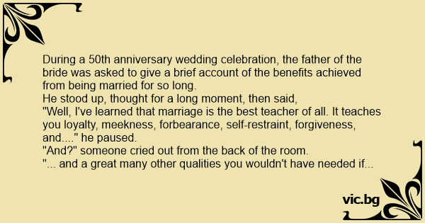 During a 50th anniversary wedding celebration, the father of the bride was asked to give a brief account of the benefits achieved from being married for so long.