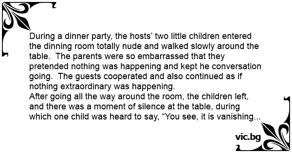 During a dinner party, the hosts’ two little children entered the dinning room totally nudе and walked slowly around the table. The parents were so embarrassed that they pretended nothing was happening and kept he conversation going. The guests cooperated and also continued as if nothing extraordinary was happening. After going all the way around the room, the children left, and there was a moment of silence at the table, during which one child was heard to say, “You see, it is vanishing cream!”