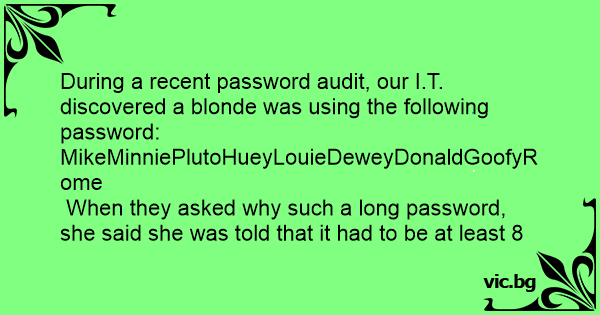 During a recent password audit, our I.T. discovered a blonde was using the following password: MikeMinniePlutoHueyLouieDeweyDonaldGoofyRome When they asked why such a long password, she said she was told that it had to be at least 8 characters long and include at least one capital.