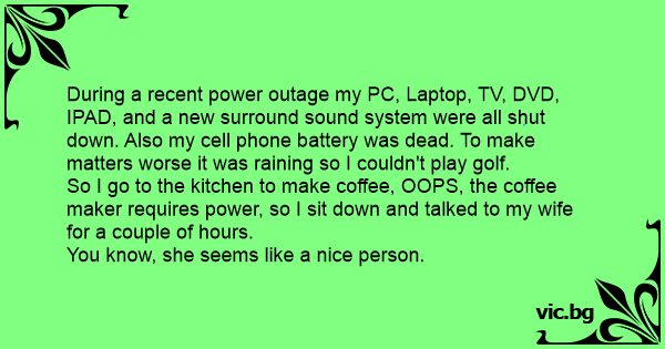 During a recent power outage my PC, Laptop, TV, DVD, IPAD, and a new surround sound system were all shut down. Also my cell phone battery was dead. To make matters worse it was raining so I couldn't play golf.
