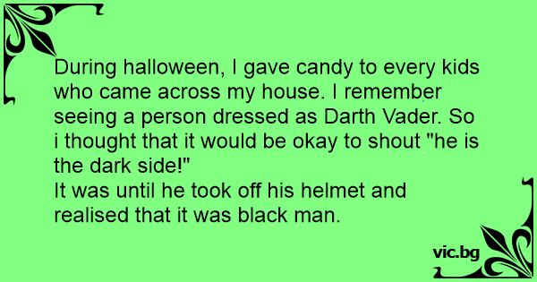 During halloween, I gave candy to every kids who came across my house. I remember seeing a person dressed as Darth Vader. So i thought that it would be okay to shout "he is the dark side!"