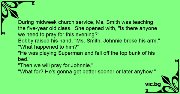 During midweek church service, Ms. Smith was teaching the five-year old class. She opened with, "Is there anyone we need to pray for this evening?"