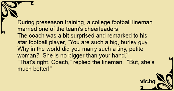 The coach was a bit surprised and remarked to his star football player, "You are such a big, burley guy. Why in the world did you marry such a tiny, petite woman? She is no вiggеr than your hand."