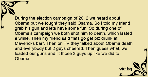 During the election campaign of 2012 we heard about Obama but we fought they said Osama. So I told my friend grab his gun and lets have some fun. So during one of Obama’s campaign we both shot him to death, which lasted a while. Then my friend said “lets go get piz drunк at Mavericks bar”. Then on TV they talked about Obama death and everybody but 2 guys cheered. Then guess what, we loaded our guns and lit those 2 guys up like we did to Obama.