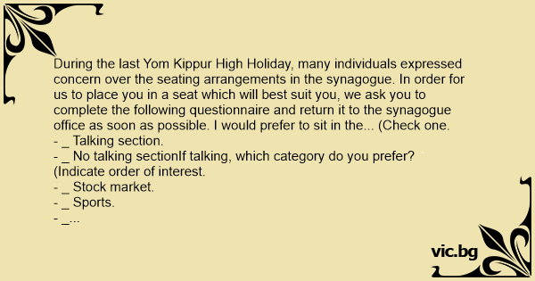 During the last Yom Kippur High Holiday, many individuals expressed concern over the seating arrangements in the synagogue. In order for us to place you in a seat which will best suit you, we ask you to complete the following questionnaire and return it to the synagogue office as soon as possible. I would prefer to sit in the... (Check one.