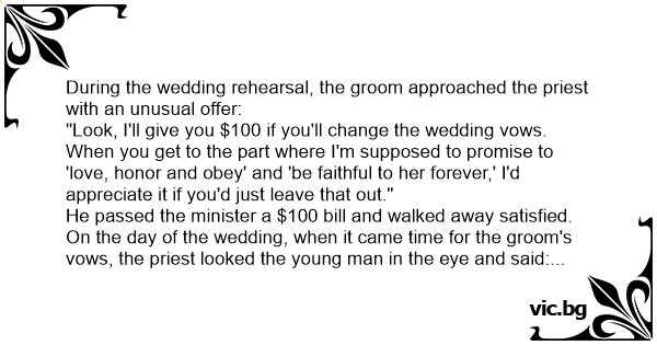 During the wedding rehearsal, the groom approached the priest with an unusual offer: