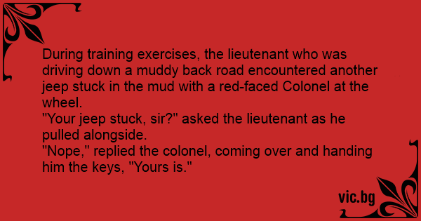 During training exercises, the lieutenant who was driving down a muddy back road encountered another jeep stuck in the mud with a red-faced Colonel at the wheel.