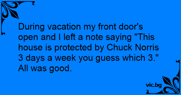 During vacation my front door's open and I left a note saying "This house is protected by Chuck Norris 3 days a week you guess which 3."