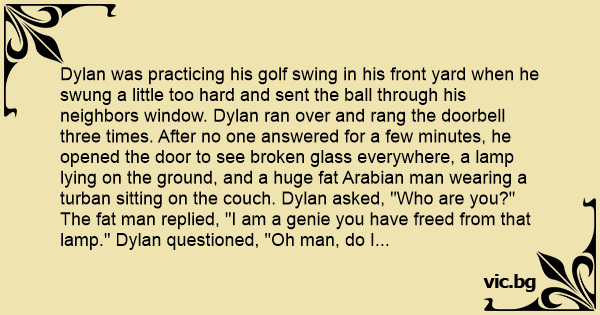 Dylan was practicing his golf swing in his front yard when he swung a little too hard and sent the ball through his neighbors window. Dylan ran over and rang the doorbell three times. After no one answered for a few minutes, he opened the door to see broken glass everywhere, a lamp lying on the ground, and a huge fат Arabian man wearing a turban sitting on the couch. Dylan asked, "Who are you?" The fат man replied, "I am a genie you have freed from that lamp." Dylan questioned, "Oh man, do I get three wishes?" The genie replied, "Since you freed me by accident you only get two and I get one." Dylan thought about it and realized what he wanted, "I want to be the best golfer ever." The surprised genie said, "You sure? Most people wish for money, but okay. Now your wife gets one wish." Dylan brought over his wife who wished right away, "I want a million dollars every week of my life." The genie said, "Granted. And now for my wish, I have been cramped up in that lamp for many years so its been a while since I've been with a woman. I want one day of wild, crazy sеx with your wife, Dylan." Dylan said, "No way!" The genie replied, "Not even for a million dollars a week?" Dylan turned to his wife, who said, "I guess for all that, I should. Well, not until Dylan leaves." Dylan said, "Okay, have fun, I guess," and left. Dylan's wife then proceeded to have wild sеx for the rest of the day with the genie. When they were finished, the genie asked how old her husband was. She said, "Forty-five." The Genie laughed and said, "Isn't he a little old to be believing in genies?"